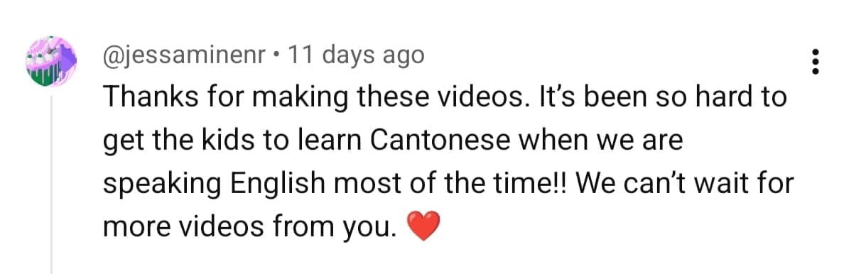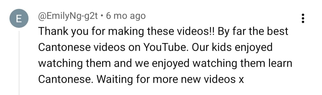 Our videos feature both English and Cantonese because we believe providing the English context is the most natural and effective way for your bilingual child to bridge the gap and start using Cantonese.
